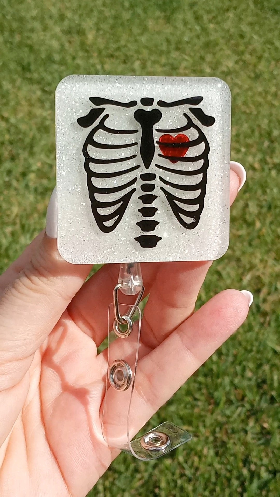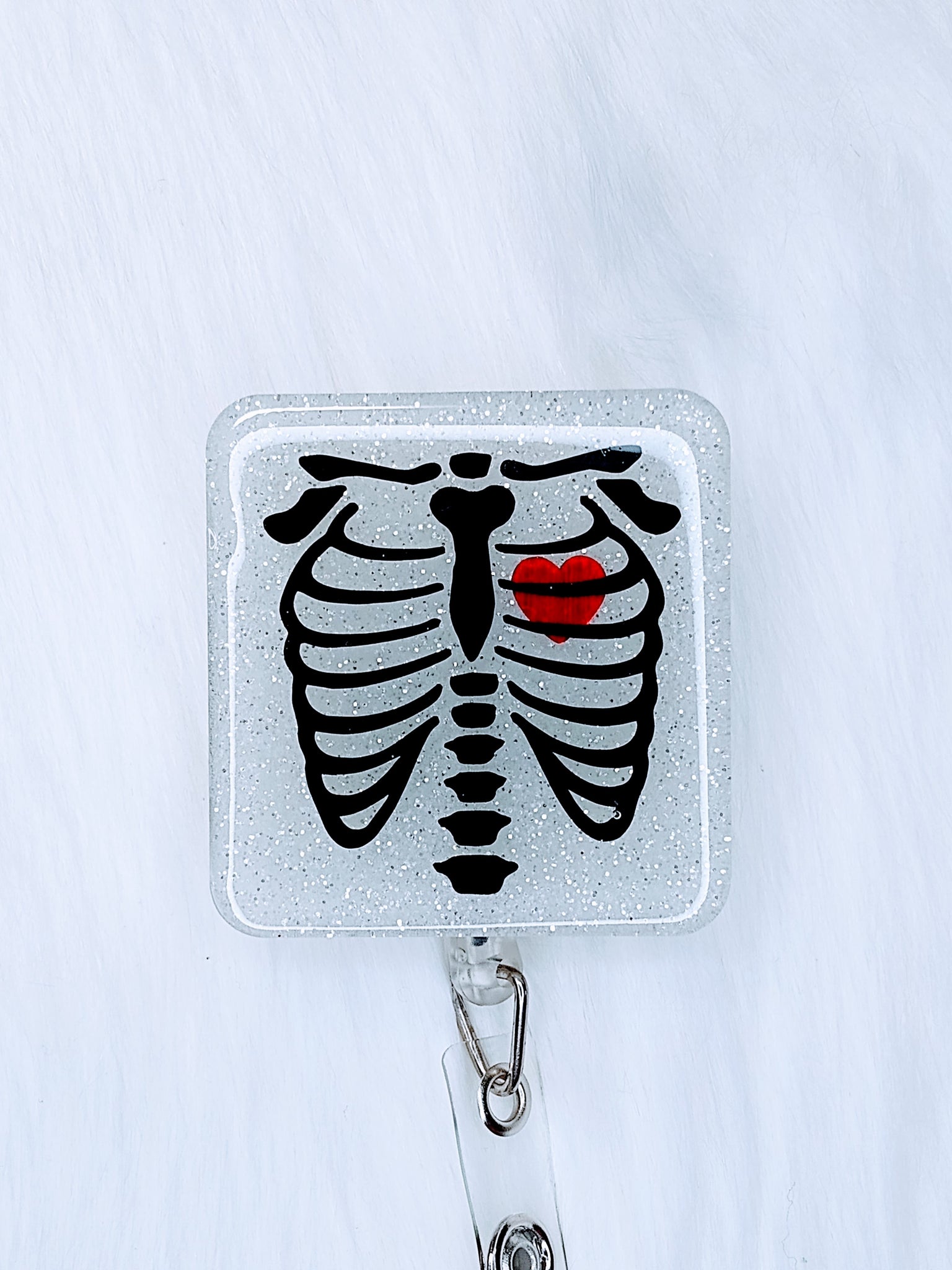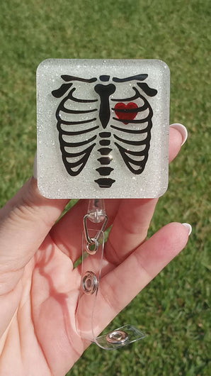 Chest X-ray glow-in-the-dark badge Reel on an alligator clip or belt clip.