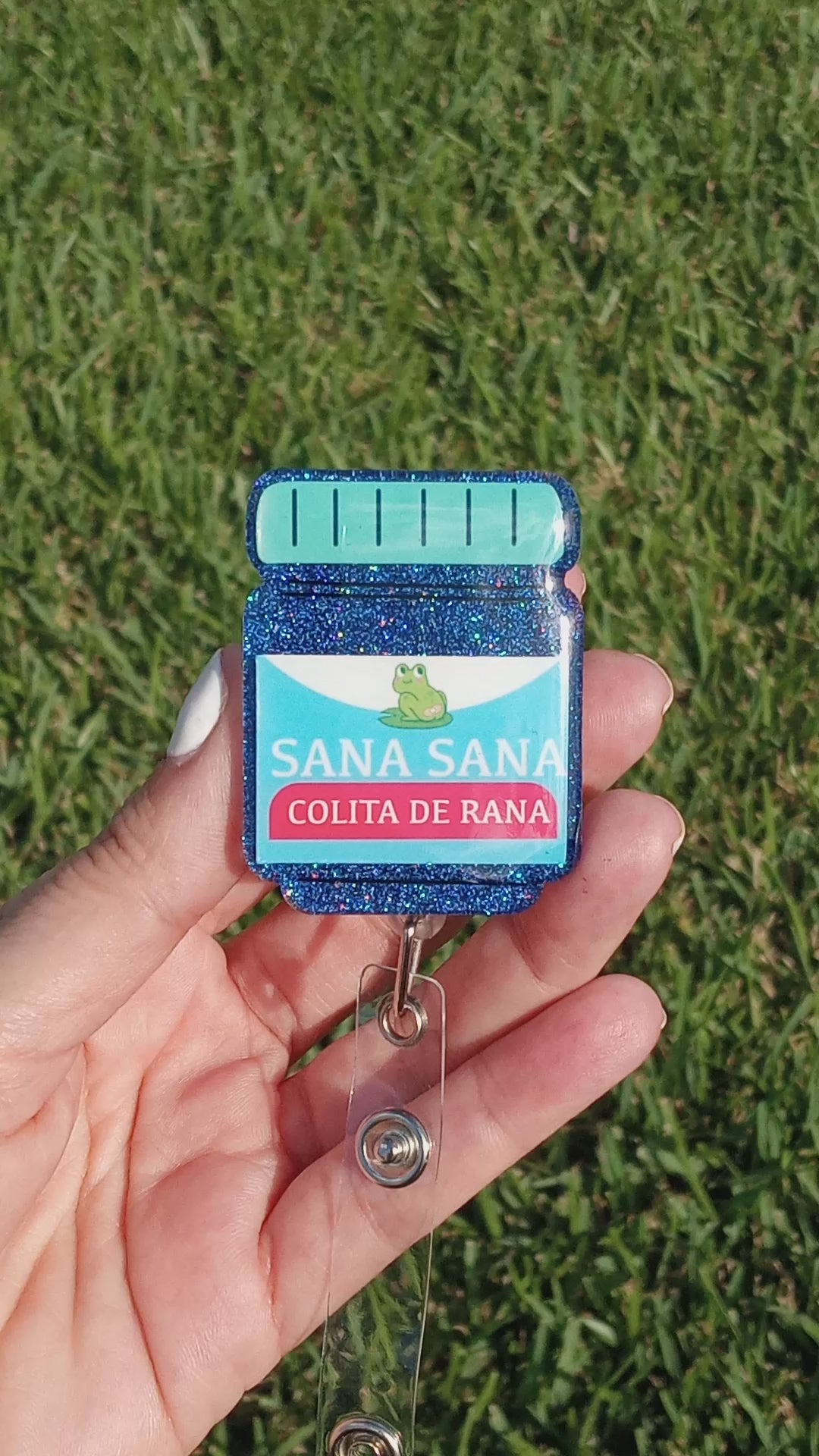 This badge reel is designed with a vibrant blue and teal color scheme, reminiscent of the classic Vicks Vapor Rub jar. The front of the badge reel features a detailed graphic of the iconic style of Vicks Vapor Rub, complete with the signature graphic of a frog with its butt with translates to "Culito de Rana"!