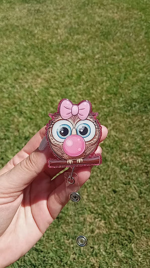Featuring a charming baby owl blowing a bubble with pink accents and glitter, this acrylic badge reel is sure to make a statement. T