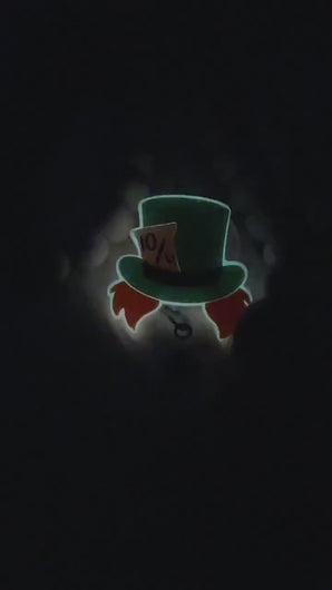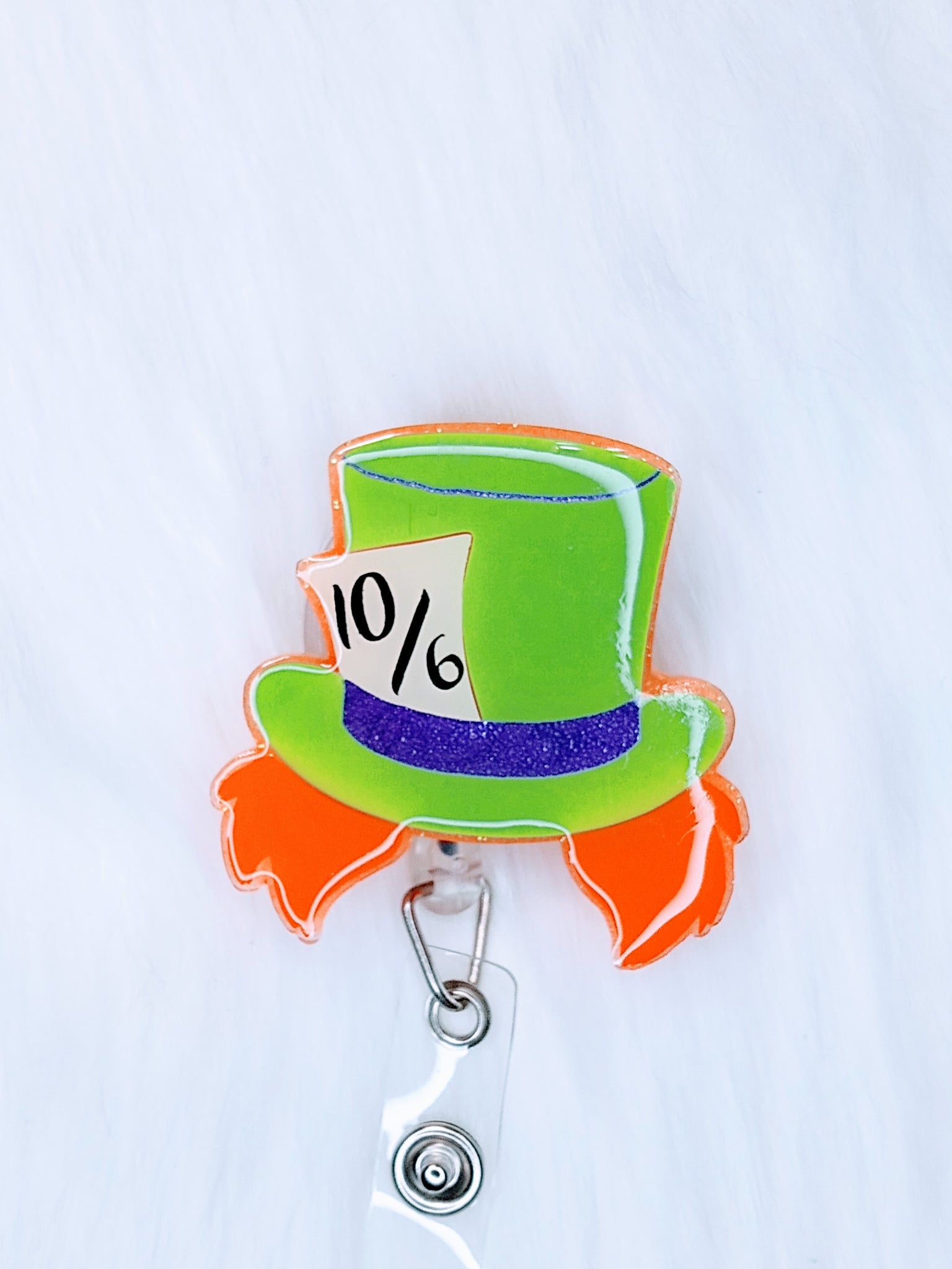 Mad Hatter glow-in-the-dark badge Reel on an alligator clip or belt clip.