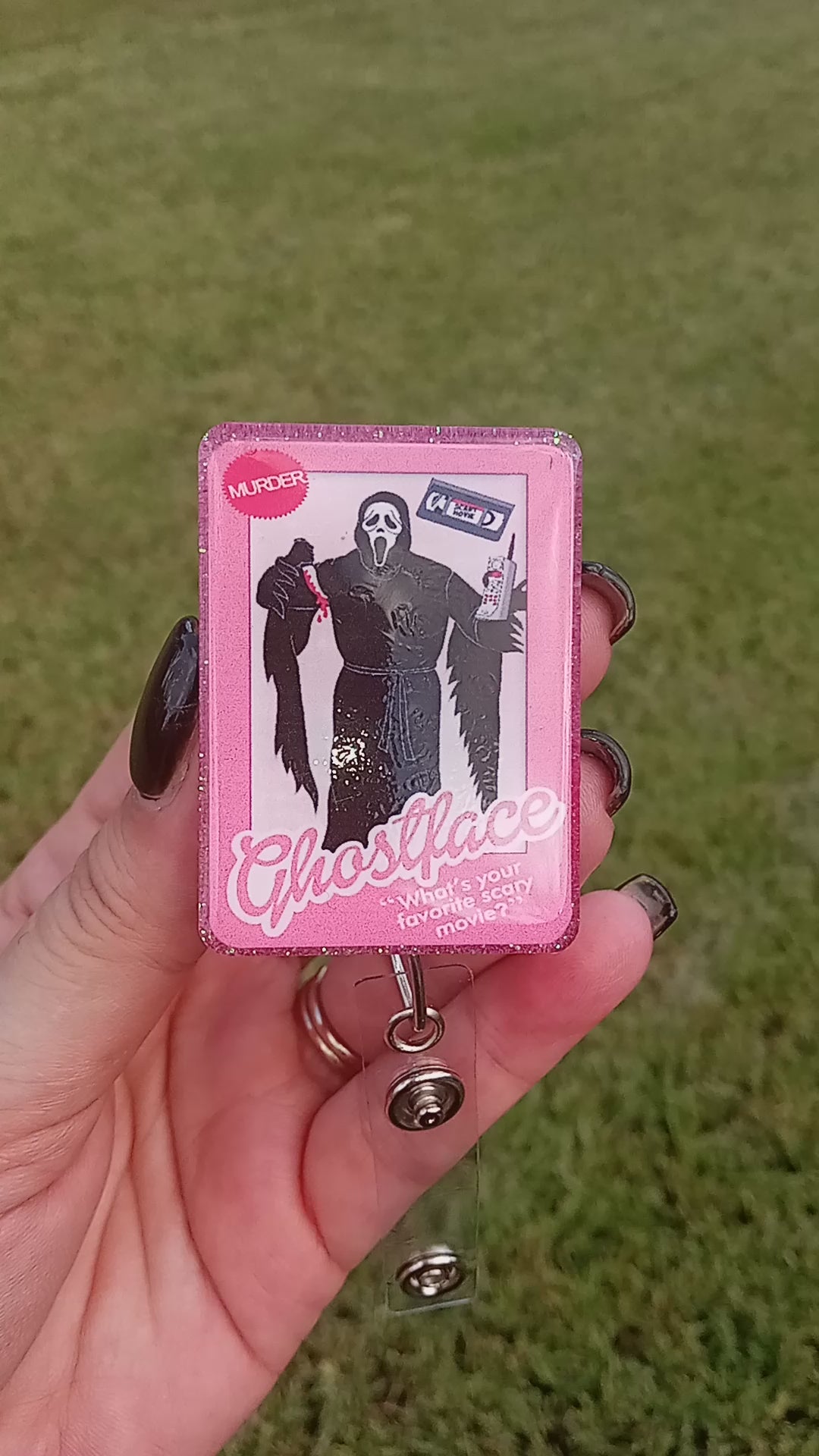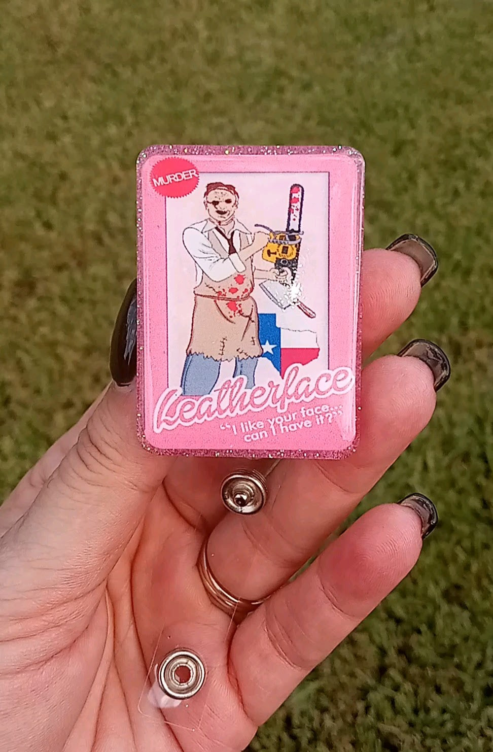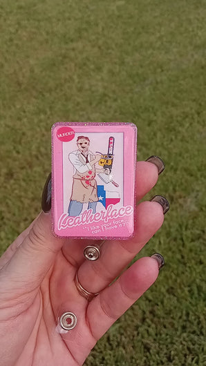 Introducing our unique and edgy "Psycho Killers Barbie-Inspired Badge Reel Box" - the ultimate blend of nostalgia and horror! This one-of-a-kind badge reel box is a must-have for fans of iconic horror villains and those who love to make a bold statement.
