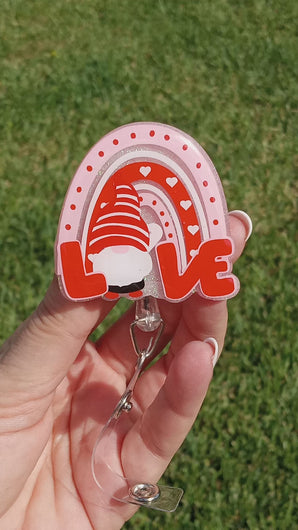 "Celebrate Valentine's Day in style with our Rainbow Gnome Love Badge Reel. Featuring a colorful rainbow gnome design with the word "love" prominently displayed, this badge reel is the perfect way to show off your love for someone special while keeping your ID readily accessible. The retractable design makes it easy to swipe your ID at work, while the sturdy clip ensures it stays securely attached to your clothing. Perfect for anyone looking to add a touch of playful charm to their workday."