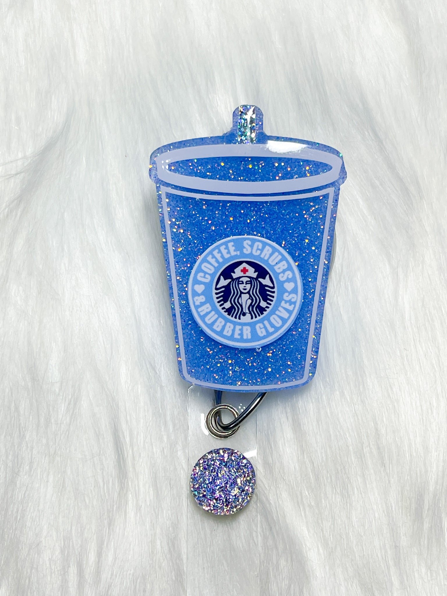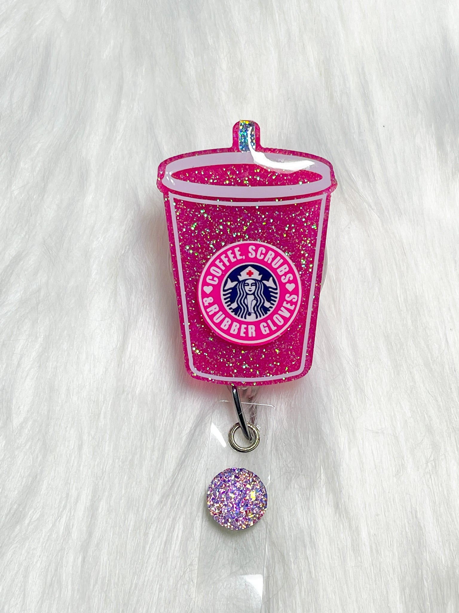 This badge reel features a miniature iced drink cup that is a replica of the iconic Starbucks cup. The cup is adorned with a colorful glitter coating, giving it a fun and playful touch. The glitter is securely attached to the cup, so you don't have to worry about it falling off or making a mess.