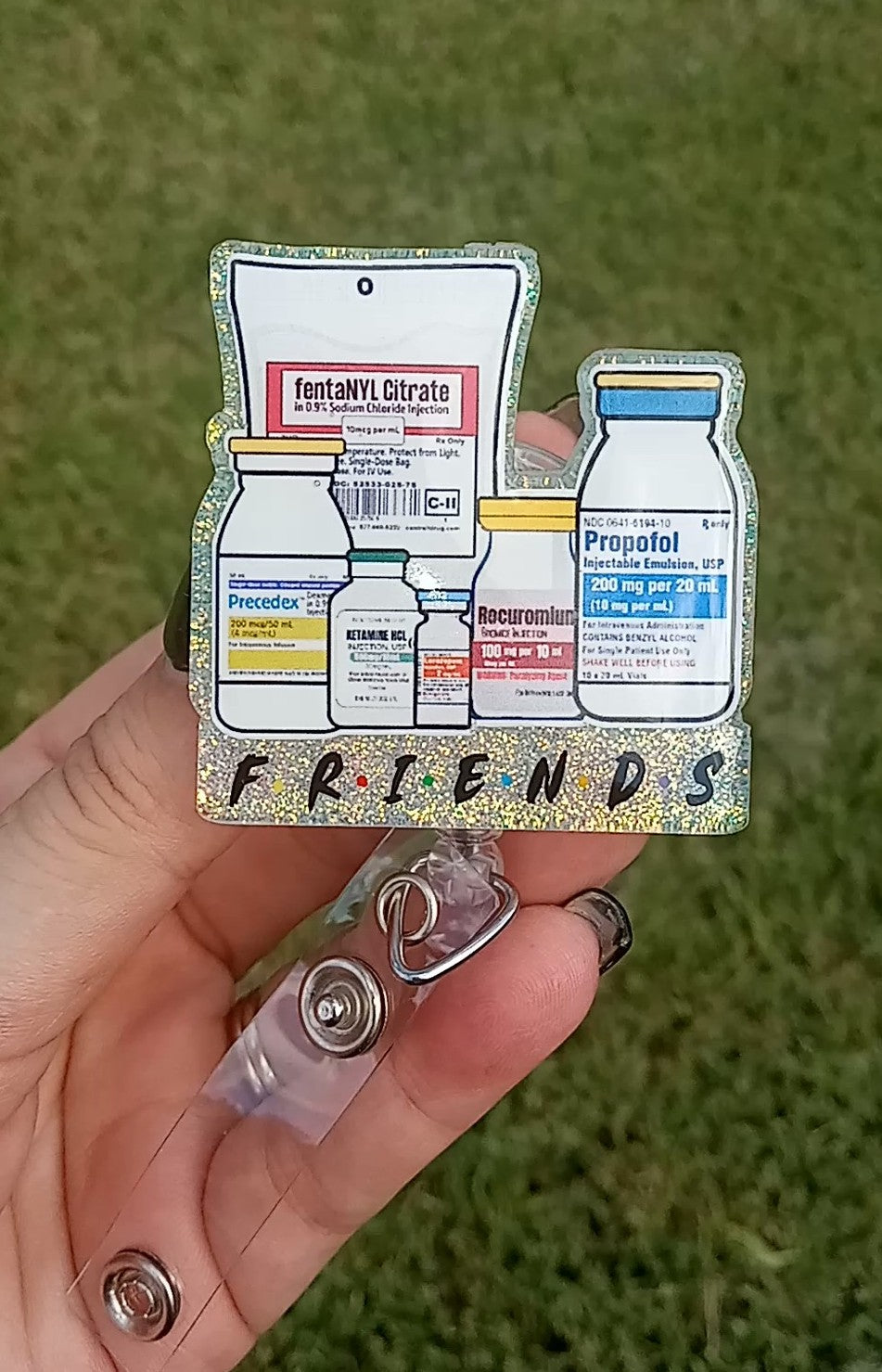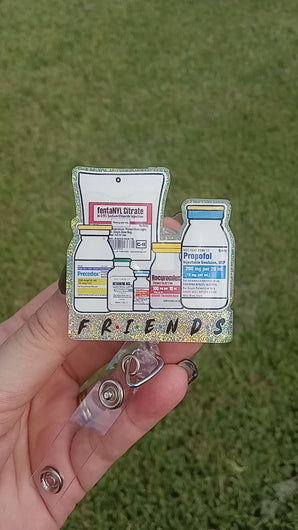 The badge reel not only celebrates the crucial role of these medications but also emphasizes the importance of collaboration among medical professionals. Beneath the captivating illustration, the word "Friends" serves as a constant reminder of the unity that powers the healthcare field.