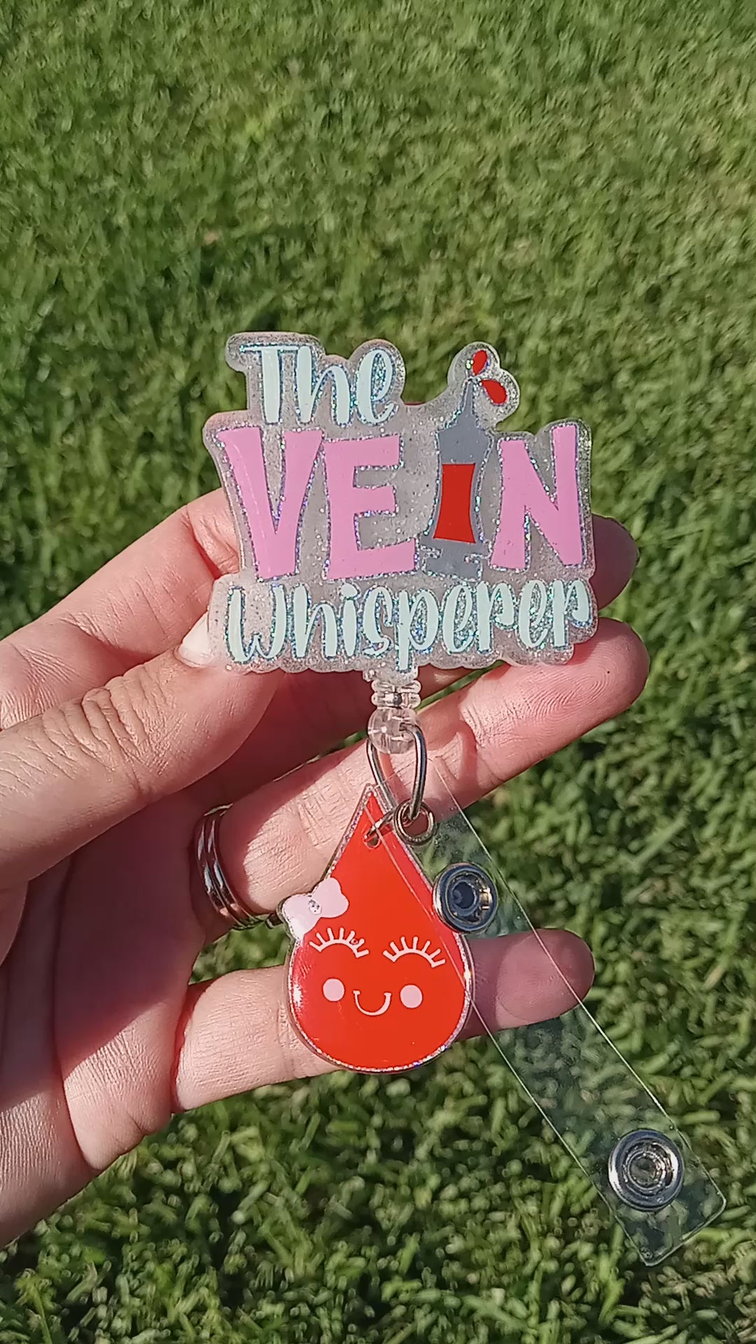 The design on the badge reel depicts a needle with a drop of blood, symbolizing the important work of those who draw blood samples for medical testing and diagnosis. The phrase "The Vein Whisperer" adds a humorous touch to the design, suggesting that the wearer is skilled and experienced in locating veins for successful blood draws.