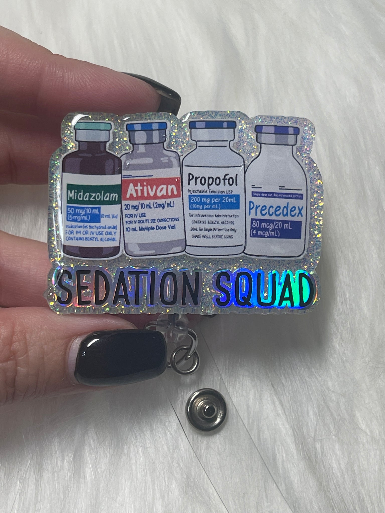 Crafted with meticulous attention to detail, our badge reel features a captivating design that captures the essence of teamwork and reliance. The vibrant emblem showcases a selection of sedation medications, each symbolizing a dependable friend in a nurse's toolkit. From the soothing presence of Midazolam to the steadfast support of Propofol, these "Trusted Friends" stand ready to assist you in providing exceptional patient care.